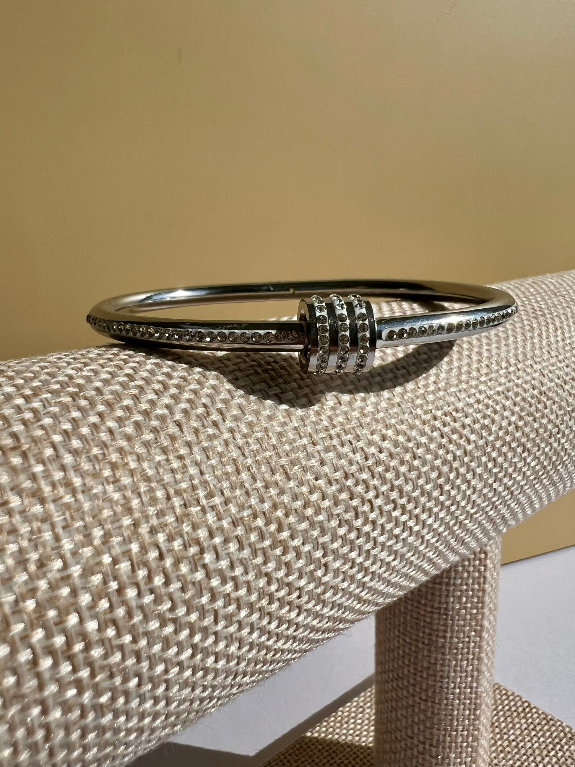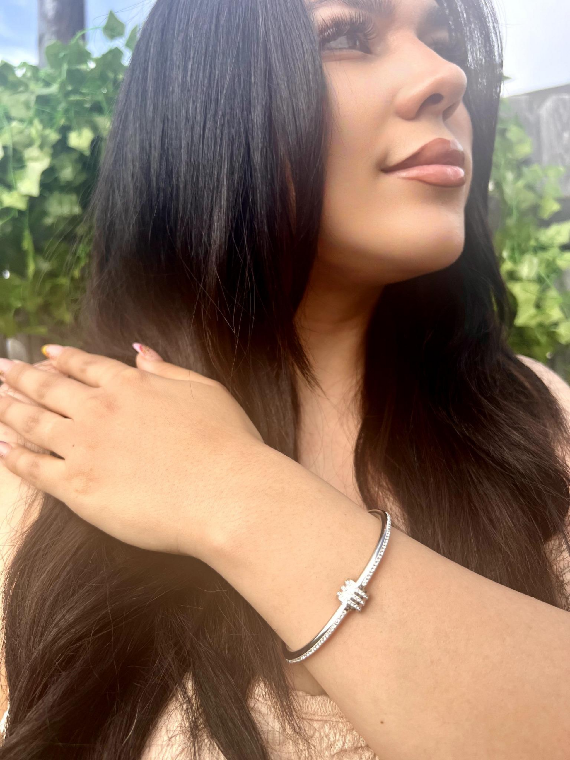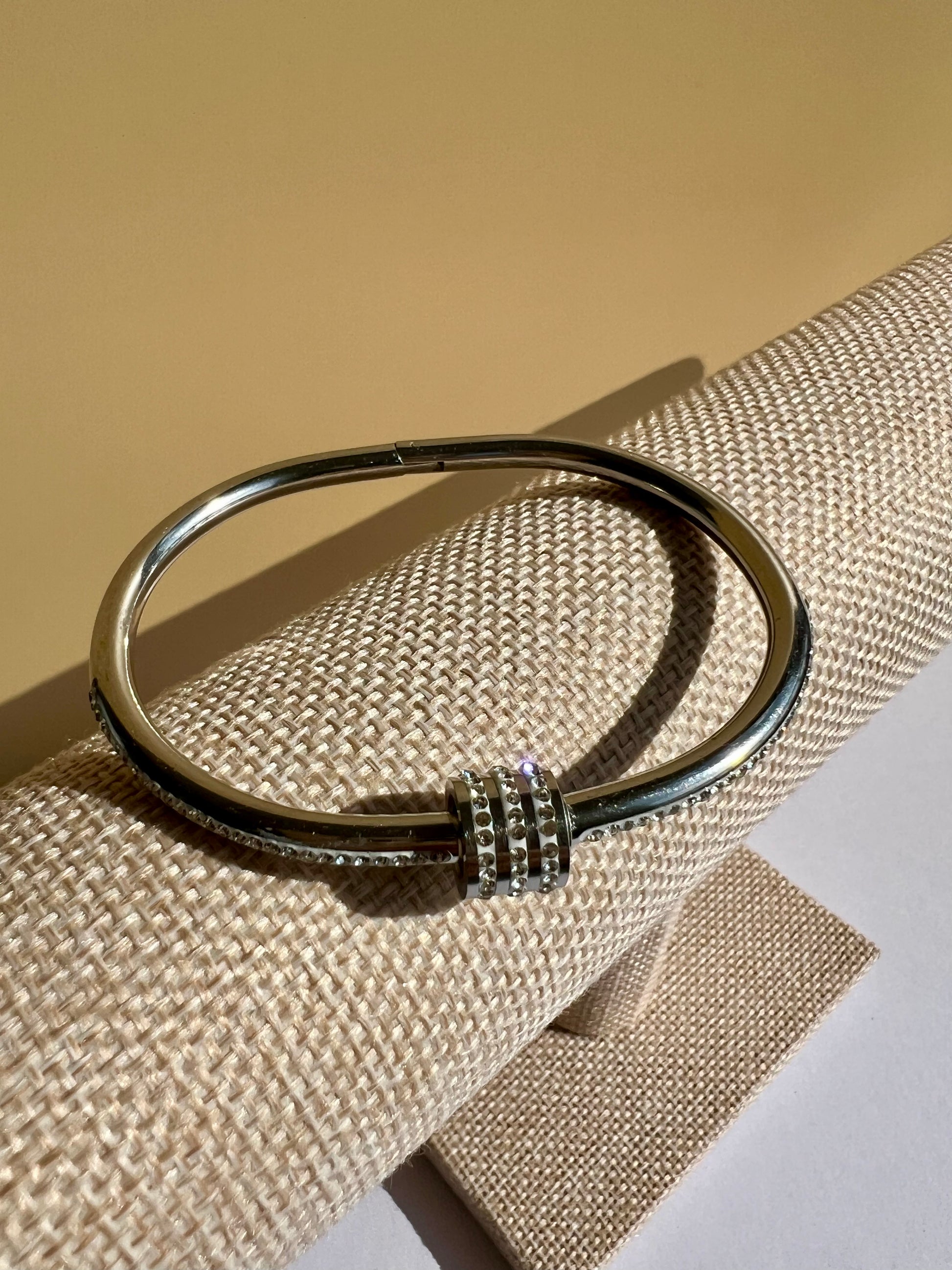 The Iridesa bangle captures the essence of the light goddess Iris with its radiant, rhinestone-filled design. Crafted from durable stainless steel, this sparkling accessory offers lasting shine and eye-catching brilliance. Its elegant shimmer makes it a perfect statement piece for those seeking both sophistication and luminous charm. "Let your light shimmer in silence."